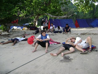 Miracle happened, we able to reach the campsite with our turtle speed and broken hands. When we reached the beach (the campsite at beach), basically i cant feel my hands already. So, i'm grateful that people help us to carry our boat inside although they only did that after 10 minutes. (we've no strength to carry the boat and therefore we were sitting and resting whilte waiting for help for 10 mins). Besides the pain muscles and tired arms, my hand 'grow' a little bubble that its painfulness cannot be underestimated. More discouraging things occured to make me very down that day. The darkness (there's no light there, except moonlight), the mosquitoes (my must-kill-enemy), the dirtyness (dun dream to bathe with clean water there, sea water got la) made me very emo. I was wondering "why would anyone from a city come to these places to suffer?" Oh ya, regarding to 'releasing unwanted stuffs from ur body' issue, it can be done naturally.. ya, naturally... with the nature. That's the way to answer the nature's call.